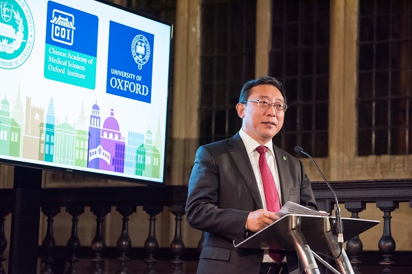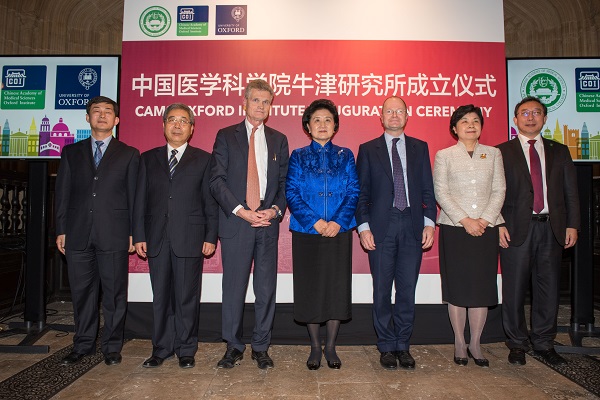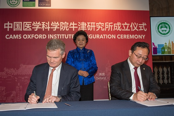 beat365官方网站牛津研究所(CAMS Oxford Institute)合作协议签字和揭牌仪式2017年12月6日下午在英国牛津大学举行。国务院副总理刘延东、国务院副秘书长江小涓、教育部部长陈宝生、科技部党组书记王志刚、国家卫生计生委副主任崔丽、驻英国使馆大使刘晓明以及参加第五次中英高级别人文交流代表团成员,国家卫生计生委参加第三届中英卫生政策对话有关代表,牛津大学常务副校长罗伯特·伊斯顿(Robert Easton),前英国医学科学院院长、牛津大学钦定医学主席(Regius Chair of Medicine)约翰·贝尔爵士等英方领导及科研人员和留学生代表,院校曹雪涛院校长、郑忠伟副院校长、张学副院校长以及有关部门负责人、部分所院负责人和科研人员代表等共100余人参加仪式。郑忠伟副院校长主持了签约和揭牌仪式。