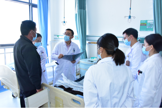 汪麟医生(左三)西藏自治区人民医院肿瘤科查房时与患者家属交流
