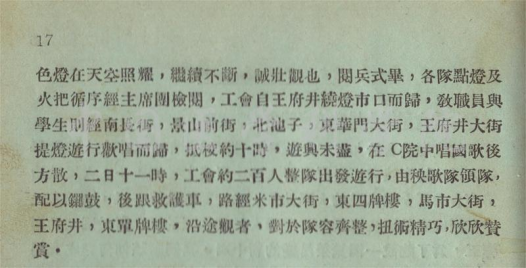 阅兵式结束后各队伍依次点灯及火把经过主席团检阅,工会自王府井绕灯市口而归,教职员与学生经南长街、景山前街、北池子、东华门大街、王府井大街提灯游行,欢唱而归,晚间十点返校时仍未尽兴,在九号院唱国歌后方散。10月2日中午十一点,工会队伍出发游行,秧歌队领队,锣鼓相随,后跟救护车,游行路线为米市大街、东四牌楼、马市大街、王府井、东单牌楼。队伍整齐,扭术精巧,沿途观众欣然赏之。