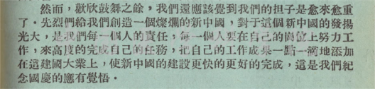 1950年10月1日,新中国诞生一年,我校学生欢欣鼓舞之际,写下纪念文章表明决心:新中国的发扬光大是我们每一个人的责任,每一个人要在自己的岗位上努力工作,高度完成自己的任务,把自己的工作成果一点一滴地添加在建国大业上,使新中国的建设更快更好完成,这是我们纪念国庆应有的觉悟。