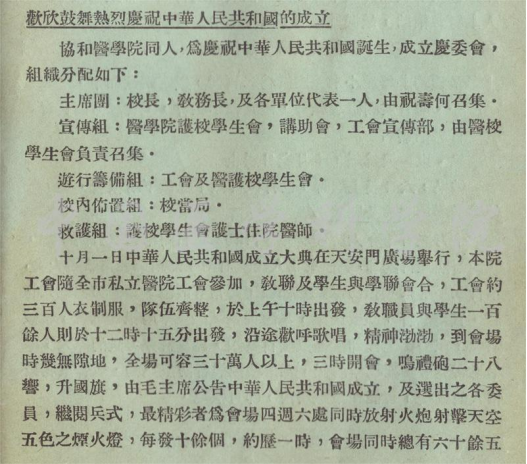 1949年为庆祝中华人民共和国诞生,协和医学院成立庆委会,设主席团、宣传组、游行筹备组、校内布置组和救护组,均由学校师生组成。