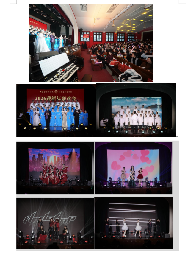 由离退休教职工组成的“协和音”合唱团以悠扬恢弘的《壮美延安》与欢快灵动的《新年好》惊艳开场。婉转旋律承载信仰之力,轻快节奏传递新春喜悦,为联欢会正式拉开序幕。博雅合唱团倾情演绎《瑶山夜歌》《天耀中华》,抒发新时代中华儿女的家国豪情与民族自信。校舞蹈队的《大漠沙海》和舞蹈串烧《茶花开了》《苏公堤》《念琵琶》唯美登场,裙裾轻扬间,东方美学的浪漫与韵味尽显,意境悠远,引人沉醉。相声《西江月》创意十足,用幽默的对白与生动的演绎,将对科研人的祝福送进协和人的心中。歌曲《Love in the dark》《乌兰巴托的夜》《海芋恋》,将青春热忱与纯粹美好尽情传递。飞扬舞蹈团的《奔跑的青春》、NINEVER女团的《What is Love》、Chroea Crew街舞社的《Hands Up》与《Swag it Out》,以及舞蹈串烧《You and me》《Girl boss》《Talk that talk》点燃全场,以饱满热烈的青春姿态展现协和青年学子的蓬勃朝气与无限活力。院校老师们带来的歌舞乐器表演《不忘初心》《疯狂动物城》,又以多元形式诠释为医为师的赤诚初心。老师和同学们以饱满热忱登台献艺,用精湛表演致敬过往时光,更将青春的憧憬与对未来的希冀娓娓诉说。