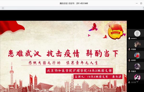在疫情防控期间,协和护理学院18本2班的师生众志成城,同心抗疫。为了进一步响应国家的号召,做好疫情的防护工作,团支部召开了线上抗疫主题会议,同学们积极响应将会议顺利进行。