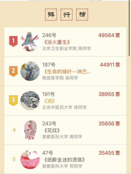 本次大赛设置人气奖评选环节,共有百万余人次参与线上投票,浏览量达224万次。经过激烈角逐,最终5幅作品获得“最佳人气奖”。北京卫生职业学院周子晖的作品《浴火重生》获得49564票,荣获“最佳人气奖”第一名。