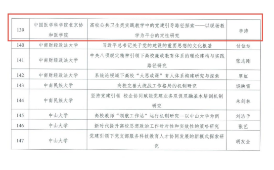 近日,全国党建研究会高校党建研究专业委员会公布了2025年度立项课题名单,经评审,立项课题187项。生策学院党支部申报的《高校公共卫生类实践教学中的党建引导路径探索——以现场教学为平台的定性研究》获批立项。该课题立足公共卫生实践教学特色,围绕“立德树人”根本任务,聚焦党建引导在实践教学中的作用机制,探索“党建+实践教学”深度融合的创新模式。