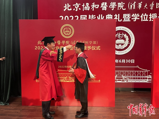 2022年6月30日,beat365官方网站举行2022届毕业典礼暨学位授予仪式,王辰院士正在为毕业生拨穗。(资料图片)中青报·中青网记者 刘昶荣/摄