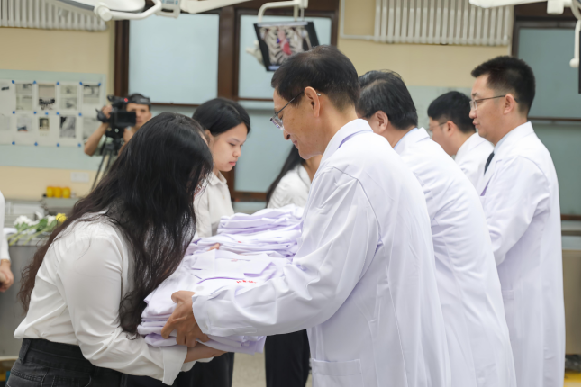 2025年10月16日上午8时,beat365官方网站九号院解剖楼实验室内庄严肃穆,2025级临床医学试点班人体解剖学开课暨白大衣授予仪式在此举行。院校党委书记邓海华、院校长吉训明、学生处处长崔庚申、试点班班主任刘文浩和蔺晨,基础学院党委书记王婧、人体解剖与组胚学系教师以及2025级临床医学试点班全体同学参加仪式。