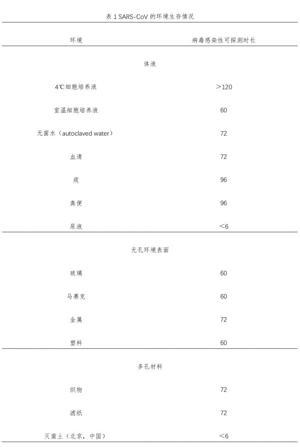 表1 SARS-CoV的环境生存情况