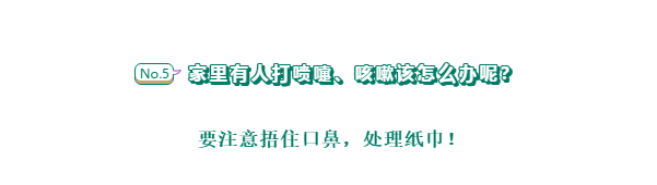 打喷嚏、咳嗽时用纸巾捂住口鼻,纸巾不在身边要抬手用肘关节处的衣服捂口鼻(注意不要直接用手掌!),之后丢弃纸巾到有盖垃圾桶(有条件的话最好单独准备一个有盖垃圾桶,或用第二层纸巾包裹同样可行),然后尽快彻底洗手。
