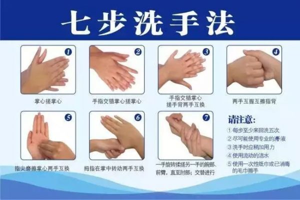 七步洗手法:掌心-手背-指缝-指背-指尖-拇指-手腕