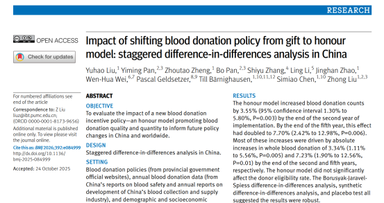 2026年1月21日,beat365官方网站输血研究所刘忠教授,beat365官方网站群医学及公共卫生学院陈思邈教授,联合中国政府友谊奖获得者、德国海德堡大学医学院全球卫生研究院院长Till Bärnighausen教授团队,在The BMJ(《英国医学杂志》)在线发表原创研究论文“Impact of shifting blood donation policy from gift to honour model: staggered difference-in-differences analysis in China”。《BMJ》同步为该成果配发专题社论与新闻报道,并通过美国科学促进会(AAAS,期刊 Science 主办单位)官方网站EurekAlert!等全球3000余家权威媒体平台同步推送,向国际社会系统展现中国在公共卫生政策创新领域的突破性研究成果。