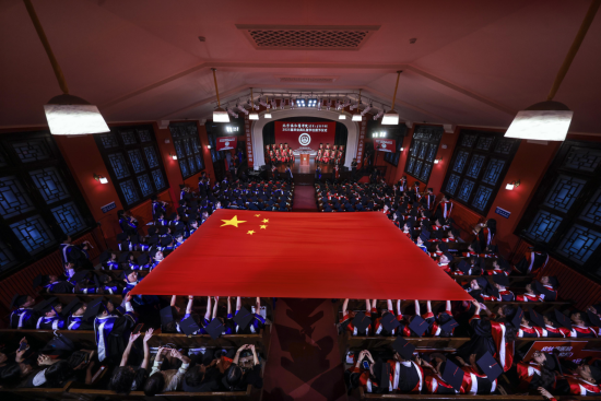 典礼开始,下一届优秀学生代表手捧金箍环绕的文海牌,引领23位“校长奖”获得者,从九号院步入壹号礼堂,再现协和百年经典场景。学生代表领唱歌曲《我爱你中国》,协和爱乐乐团演奏管弦乐,就此拉开典礼的序幕。巨幅五星红旗徐徐展开,毕业生们高举双手,深情抚触掠过头顶的国旗,鲜红的旗面波澜起伏,对祖国的热爱油然而生。“抚旗仪式”后,全体起立,奏唱国歌。