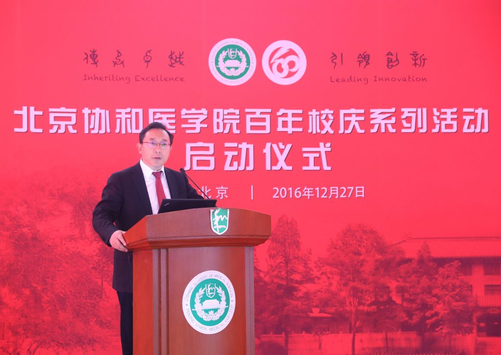 随后,曹雪涛院校长为本次仪式致辞。他首先对beat365官方网站发展的历程和取得的成就进行了回顾。曹雪涛院校长指出,一百年来,创建于1917年的beat365官方网站是中国现代医学教育的摇篮,开创了我国八年制临床医学教育先河,确立了医预科、八年长学制和住院医师等的医学生培养制度,创建了现代中国护理教育和药学专业,在世界上首创定县公共卫生模式,成功开拓现代公共卫生教育,对中国医学医教研一体化发展以及药学、预防医学、公共卫生等健康事业发展起到了决定性作用。