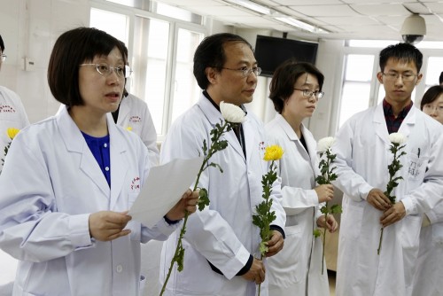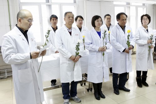 最后,全体教师和学生向大体老师三鞠躬并默哀致敬一分钟,结束了开课仪式。