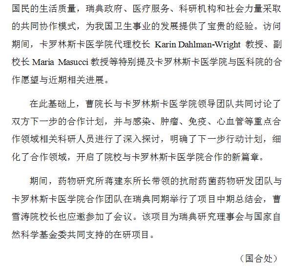 曹雪涛校长陪同李斌主任访问卡罗林斯卡医学院