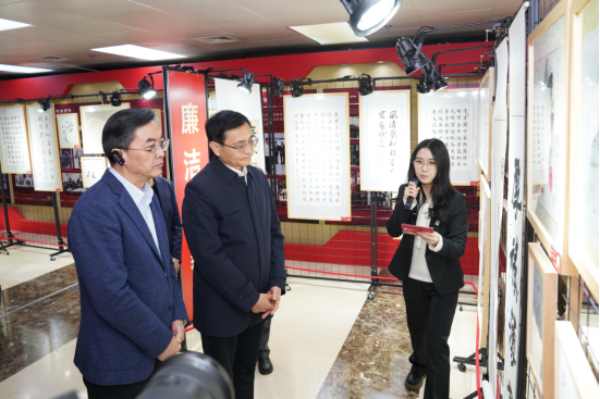 书画展区:包含“廉洁从政”“廉洁用权”“廉洁修身”“廉洁齐家”四个主题,其理念源自《党员领导干部廉洁自律规范》,展厅以一条红线将作品串联起来,喻示党员干部需始终坚守廉洁底线、不越纪律红线。