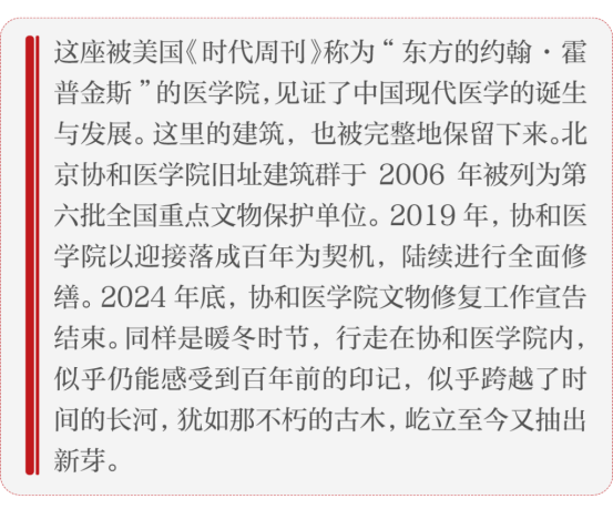同样是暖冬时节,行走在协和医学院内,似乎仍能感受到百年前的印记,似乎跨越了时间的长河,犹如那不朽的古木,屹立至今又抽出新芽。