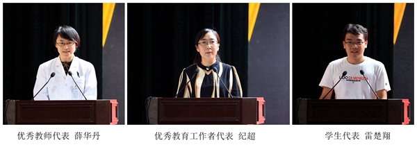 优秀教师代表薛华丹教授和优秀教育工作者代表纪超教授分别发言,分享了各自的教学科研工作经历,感谢前辈、导师、领导的培养和支持,并表示将始终坚守对教育事业的忠诚,为院校下一个百年的发展多做贡献。学生代表2014级临床医学的雷楚翔同学献辞,代表协和学生向全体教师送上了诚挚的节日祝福,感谢一代代协和人对协和精神的亲身践行,才使得现代医学生在百年之后依旧能够领略、学习协和风采。