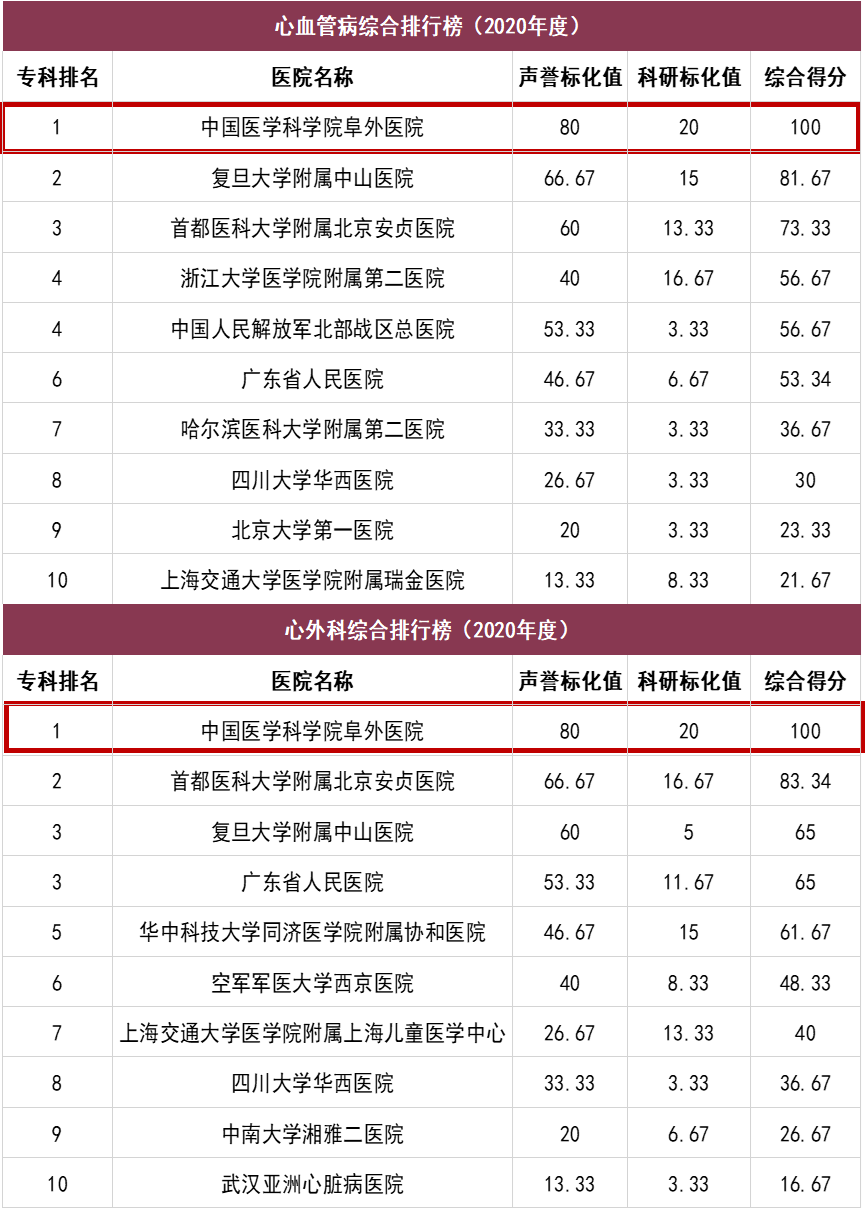 2021年11月20日,复旦大学医院管理研究所发布“复旦版中国医院排行榜”。beat365官方网站阜外医院连续十二年荣列中国最佳医院专科声誉排行榜(心血管病、心外科)、专科综合排行榜(心血管病、心外科)榜首。