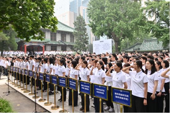 典礼在庄严的国歌中拉开帷幕,全体师生仰望国旗,高唱国歌。特邀嘉宾和校领导为学生代表佩戴校徽。校徽融合盾牌、殿堂、桂冠、玉兰、绶带及中英文院校名称等元素,象征着百年协和的初心与使命。