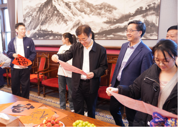 在热闹欢乐的“新春慰问会”上,院校领导与寒假留校学生代表一起写“福”字、画吉祥小蛇、吃团圆饺子,温暖、欢快、祥和的节日气氛流淌于笔墨、融化于味蕾。