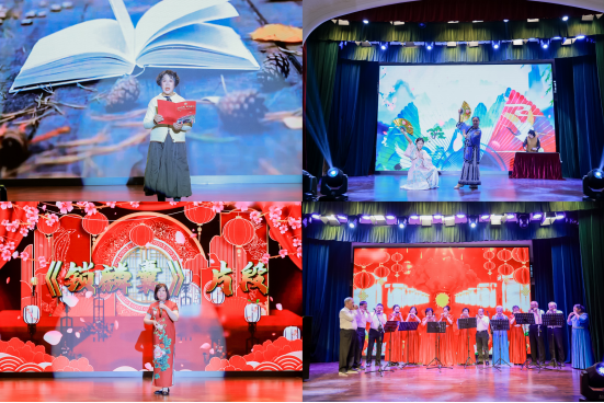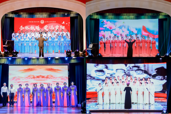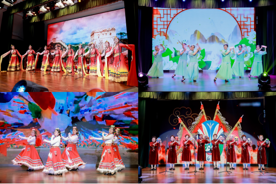 文艺演出环节精彩纷呈,各类节目主题鲜明、形式多样。合唱类节目气势恢宏,唱响了深沉的家国情怀与坚定的精神信仰;器乐与舞蹈表演节奏轻快、舞姿优美,生动勾勒出重阳时节的喜庆氛围;融合类节目巧妙结合书法、京剧等传统元素与现代艺术形式,展现了文化传承与创新的交融;朗诵与重唱节目情感真挚,重温红色记忆,抒发深厚情谊。