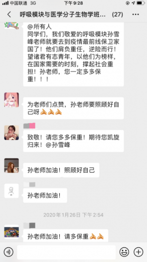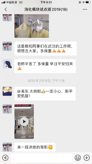 居家隔离的日子里,在认真学习理论知识之余,我们深深惦念着两位前线的师长。两位老师在紧张工作之余,仍然与我们分享前线的工作与生活。虽然厚重的防护服让人看着就窒息,但是透过屏幕,我们能感受到老师们的喜悦与兴奋,我相信老师们如此的乐观态度是他们发自内心的对工作的热情与对患者的责任。