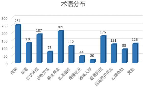 术语是指各门学科所使用的表示科学概念的词语。COVID Term中的术语包含人们在从事新型冠状病毒肺炎相关研究、知识交流、知识传播等活动中所采用的词语,可以是词,也可以是词组。图1是COVID Term V1.1版本中的术语分布。