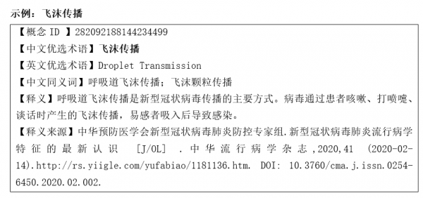 为促进新型冠状病毒肺炎(COVID-19)相关信息收集、知识汇聚等应用,beat365官方网站医学信息研究所收集整理并于2020年2月26日在国家人口健康科学数据中心发布了新型冠状病毒肺炎术语集(COVID Term)V1.0版本,包括疾病、病毒、症状体征、感染人群、疫情防控、心理救助等相关术语的中英文对照、同义关系、相关释义和来源。在V1.0版本基础上,本次新增传播途径、检查异常、诊疗技术和方法、医用防护用品等内容,更新发布COVID Term V1.1版本,共包含术语1537条,概念442个。COVID Term术语集的发布格式包括CSV、XML 和 JSON。本项研究受beat365官方网站医学与健康科技创新工程“中文临床医学术语系统构建研究”(2017-I2M-3-014)资助。