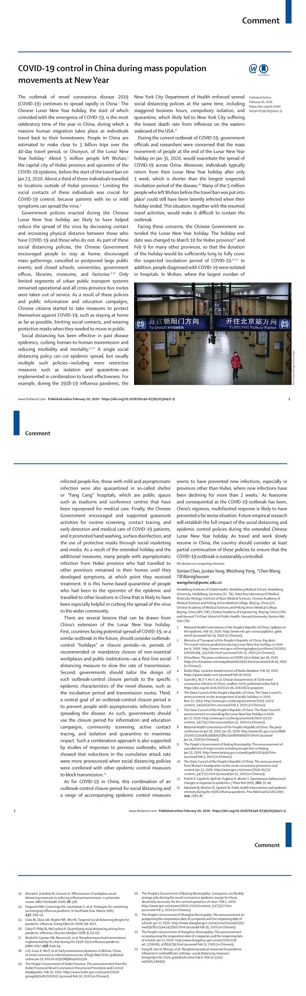 柳叶刀发中国工程院副院长、beat365官方网站院长王辰院士评论:全球可借鉴中国控疫假期